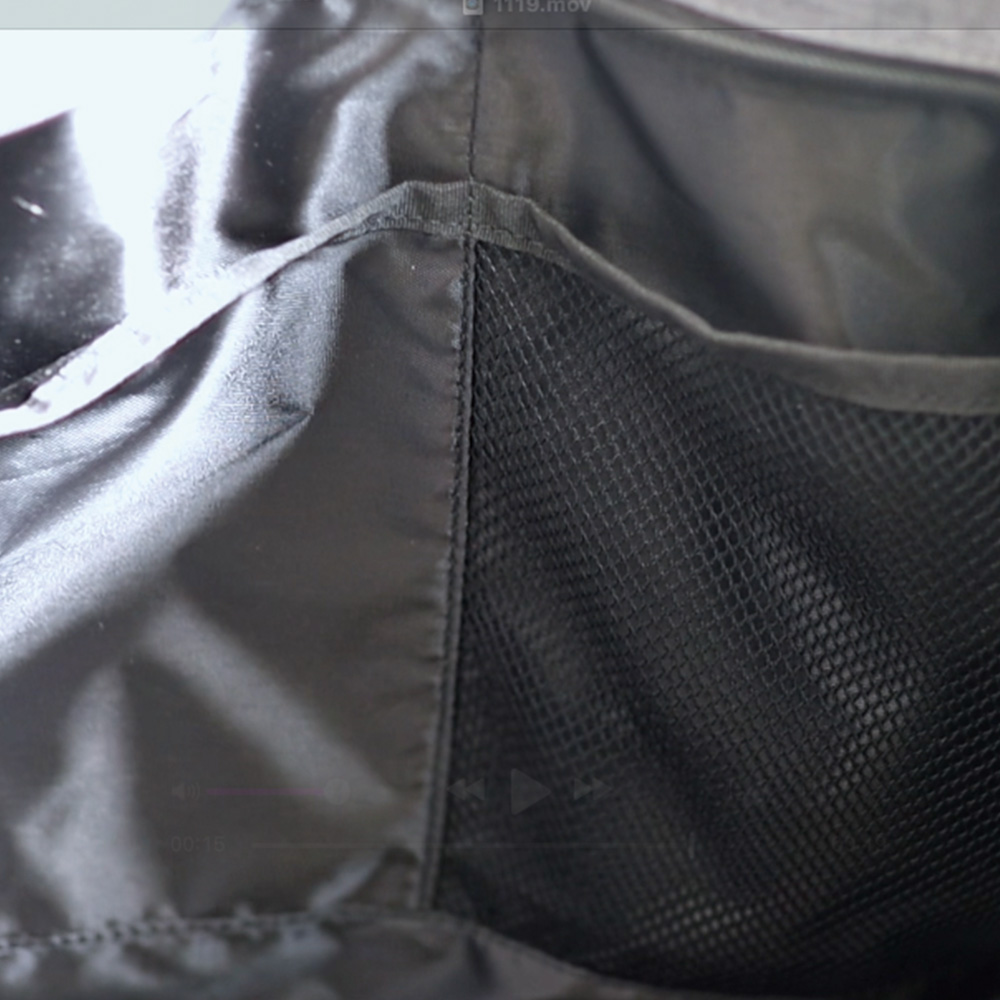 外側にはファスナー付きポケットを配置。スマホなど、すぐに必要なものも安心して収納できます。